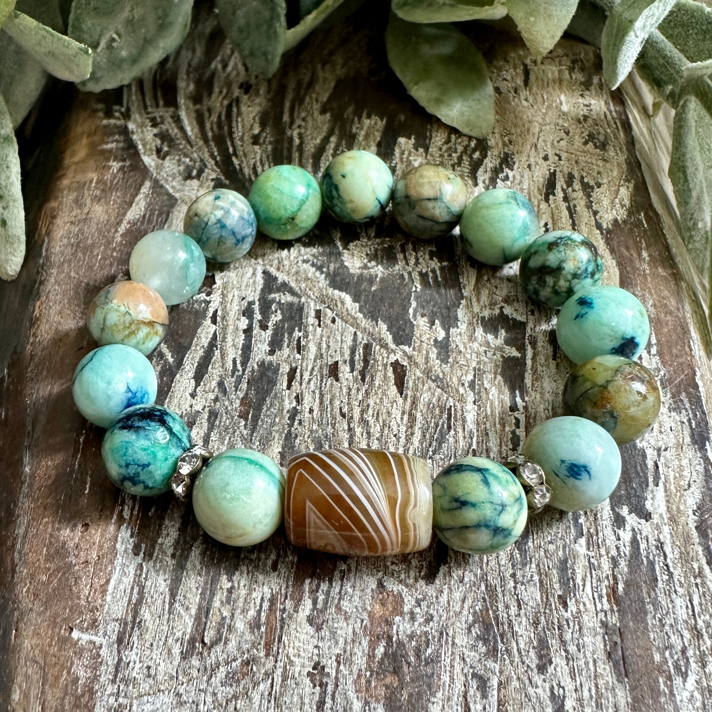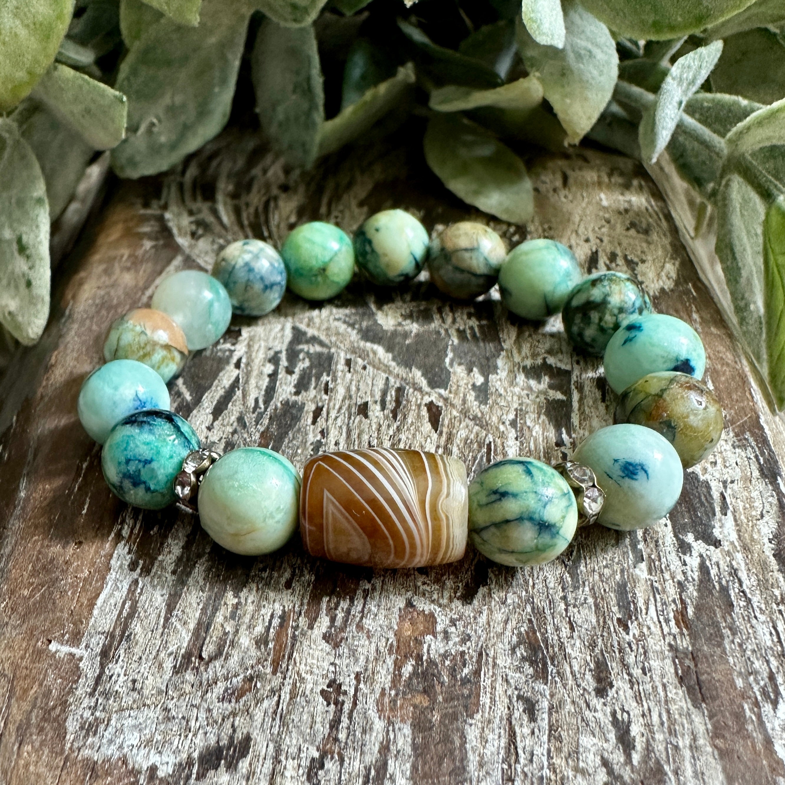 We've designed our Agate + Chrysocolla bracelet with 10mm sized stones. No two bracelets wll be alike as these stones vary in striations, inclusions, and colors.