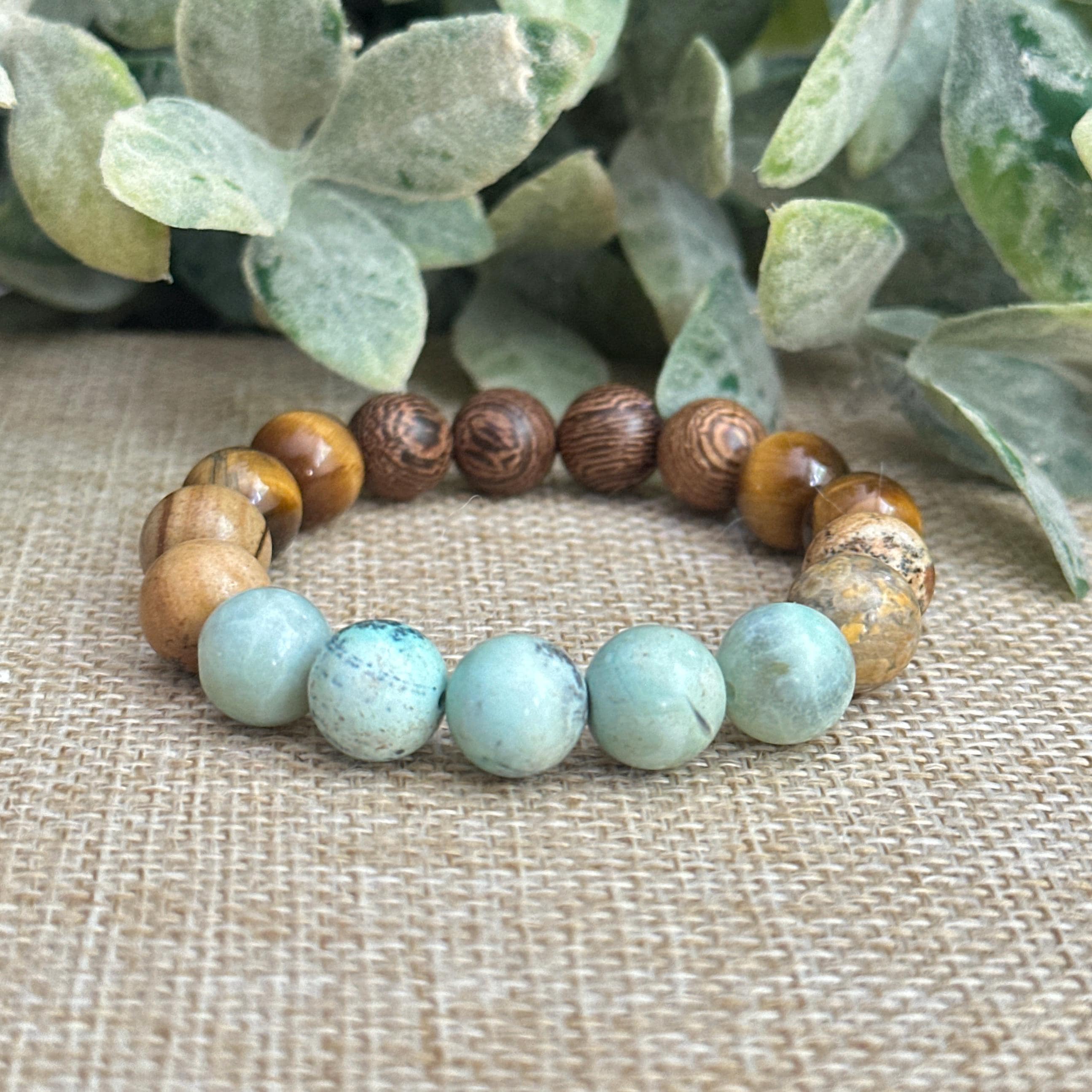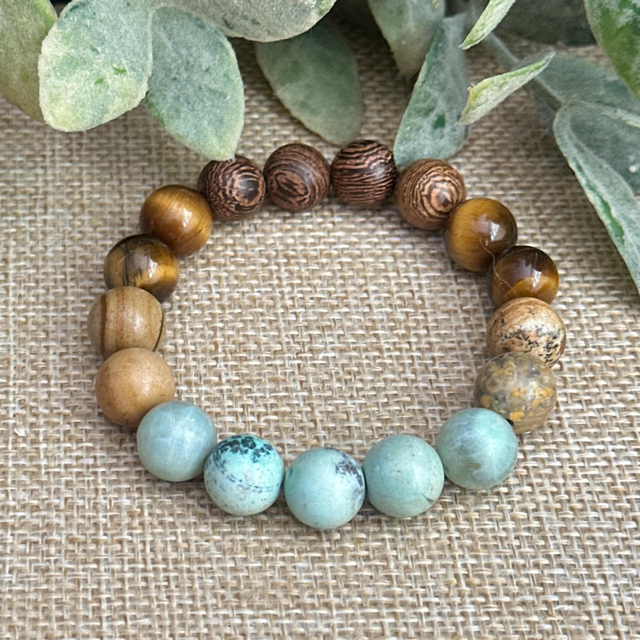 Designed with 10mm natural stones and wood beads whose properties instill an energy of calmness over anxiety. Balance and healing over depression.