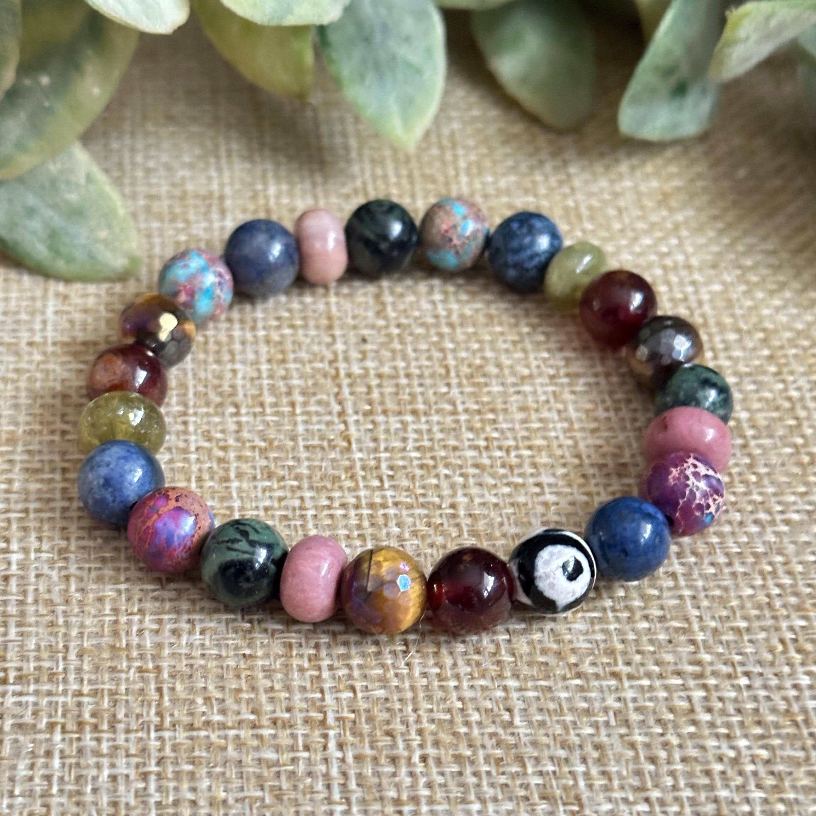 Roots and Wings is a mosaic of evolution and harmony. Designed with 8mm sized stones in deep jewel tones, this bracelet refreshes each chakra. Every stone reflects a facet of growth: Hessonite and Kambaba Jasper keep you rooted in calm strength; Rhodonite and Green Garnet open the heart to love and compassion; Imperial Jasper brings balance and confidence; Dumortierite and Mystic Tiger’s Eye lift your energy toward insight and awareness. Together, they express the art of harmony and evolution: Learning to stay centered as you expand, and rising higher while staying connected to what truly grounds you.