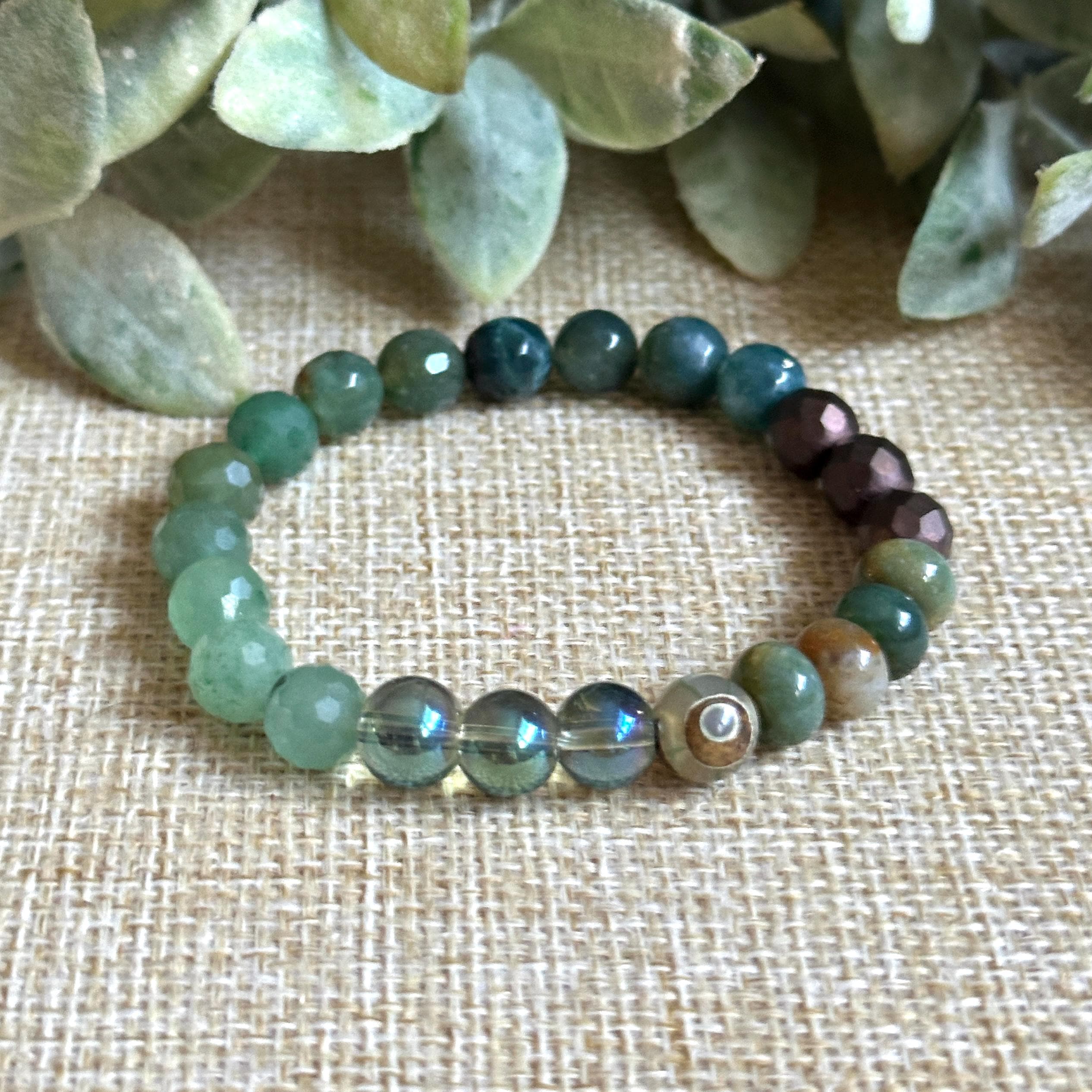 Designed with 8mm sized stones, Embodied Gratitude is about grounding thankfulness in the body, not just the mind. It’s the calm after effort, the moment when you realize how far you’ve come and can finally breathe it in. This bracelet blends earthy greens and bronze tones to balance heart and root: soft emotional openness anchored in steady strength.