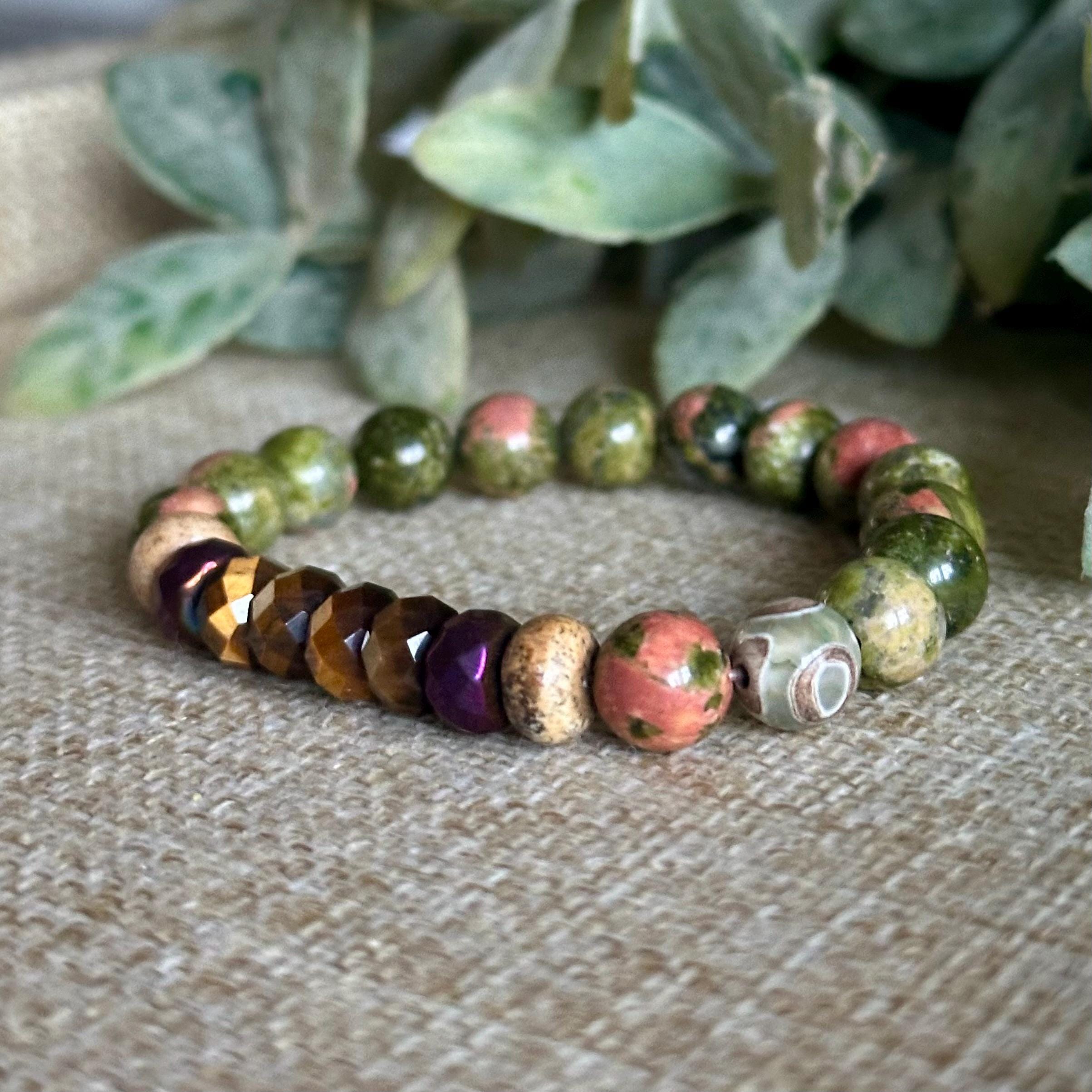 An optional DZI Agate hidden among the unakite. Traditionally associated with protection and clarity, here it also helps quiet outside noise, and self doubt so creative ideas can flow from within.