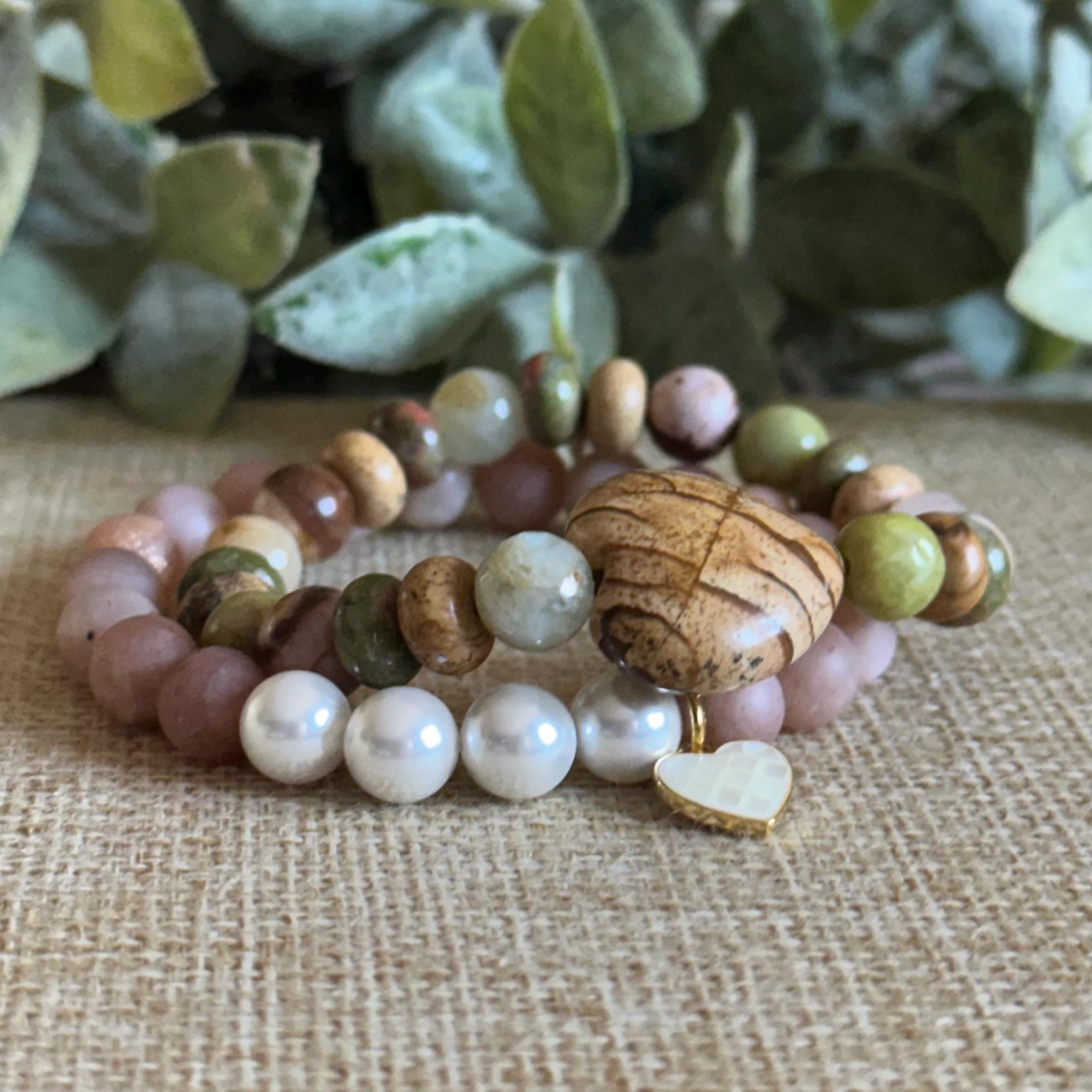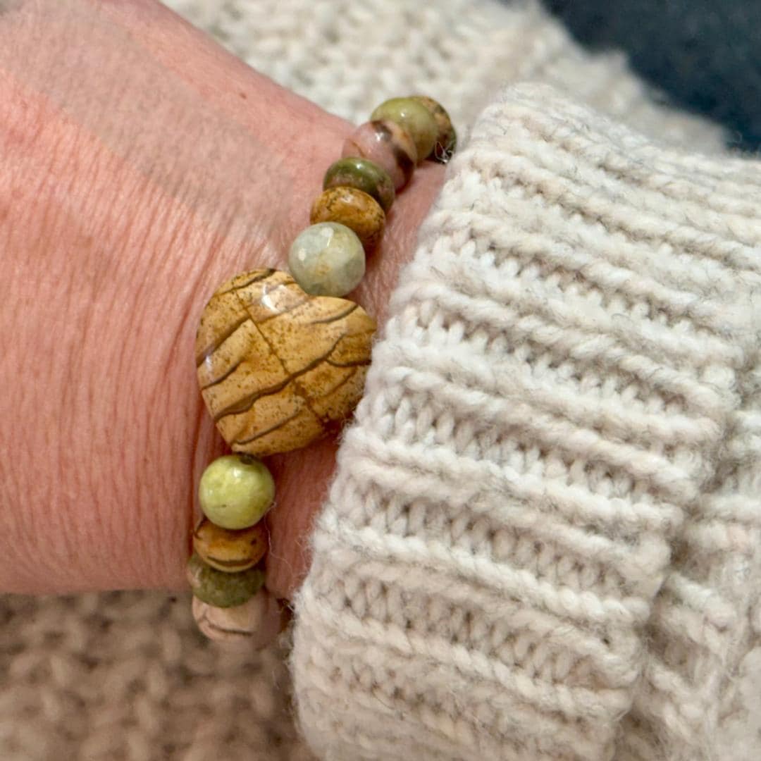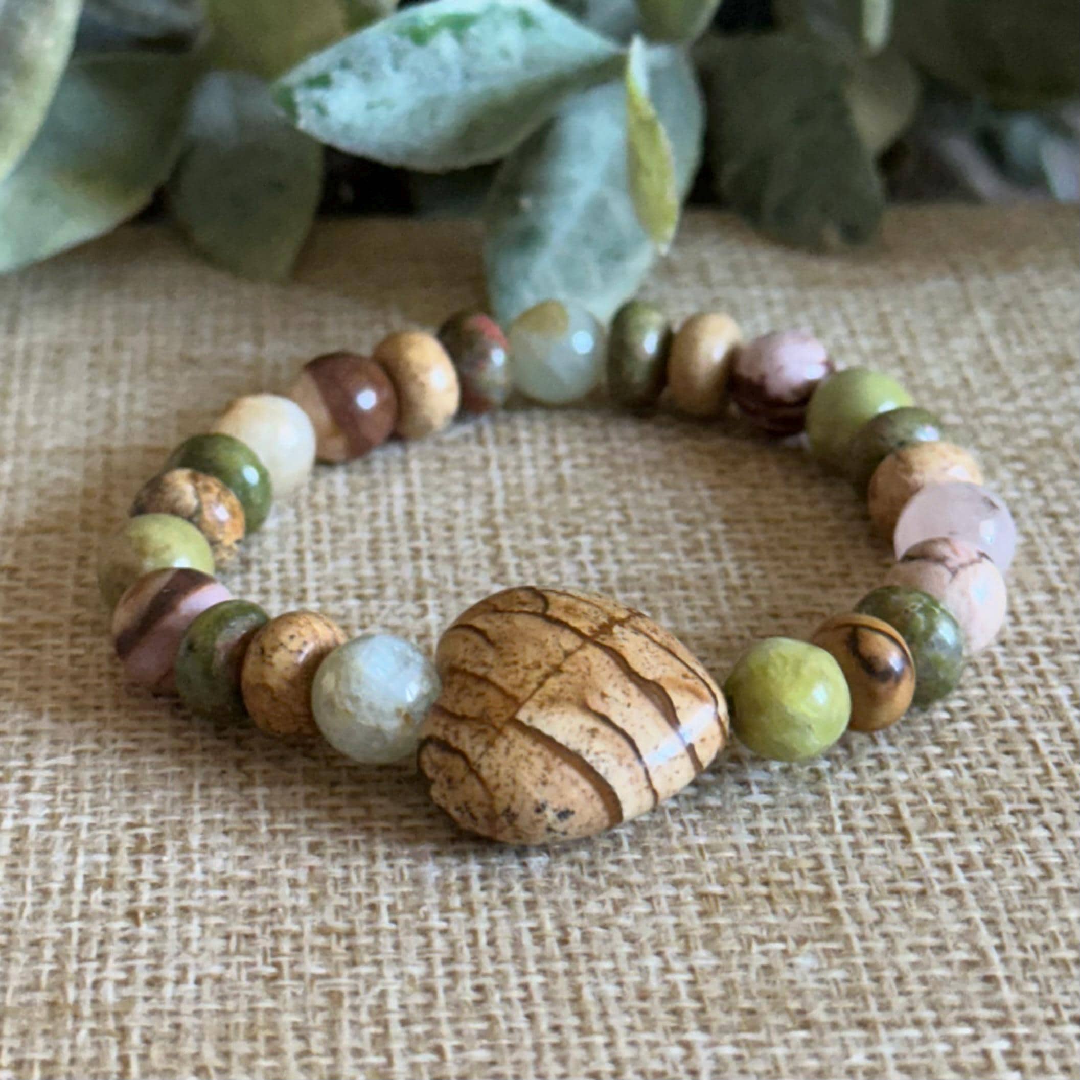 Designed with a large Picture Jasper heart at the center, surrounded by smooth 8mm stones, this bracelet is a grounded expression of love in all its forms. Be Mine is meant for celebrating connection, whether you’re honoring a relationship or choosing to claim that love for yourself (or both!). It represents affection that feels steady, comforting, and real. A quiet reminder that love does not need to be loud to be meaningful. Love lives here.