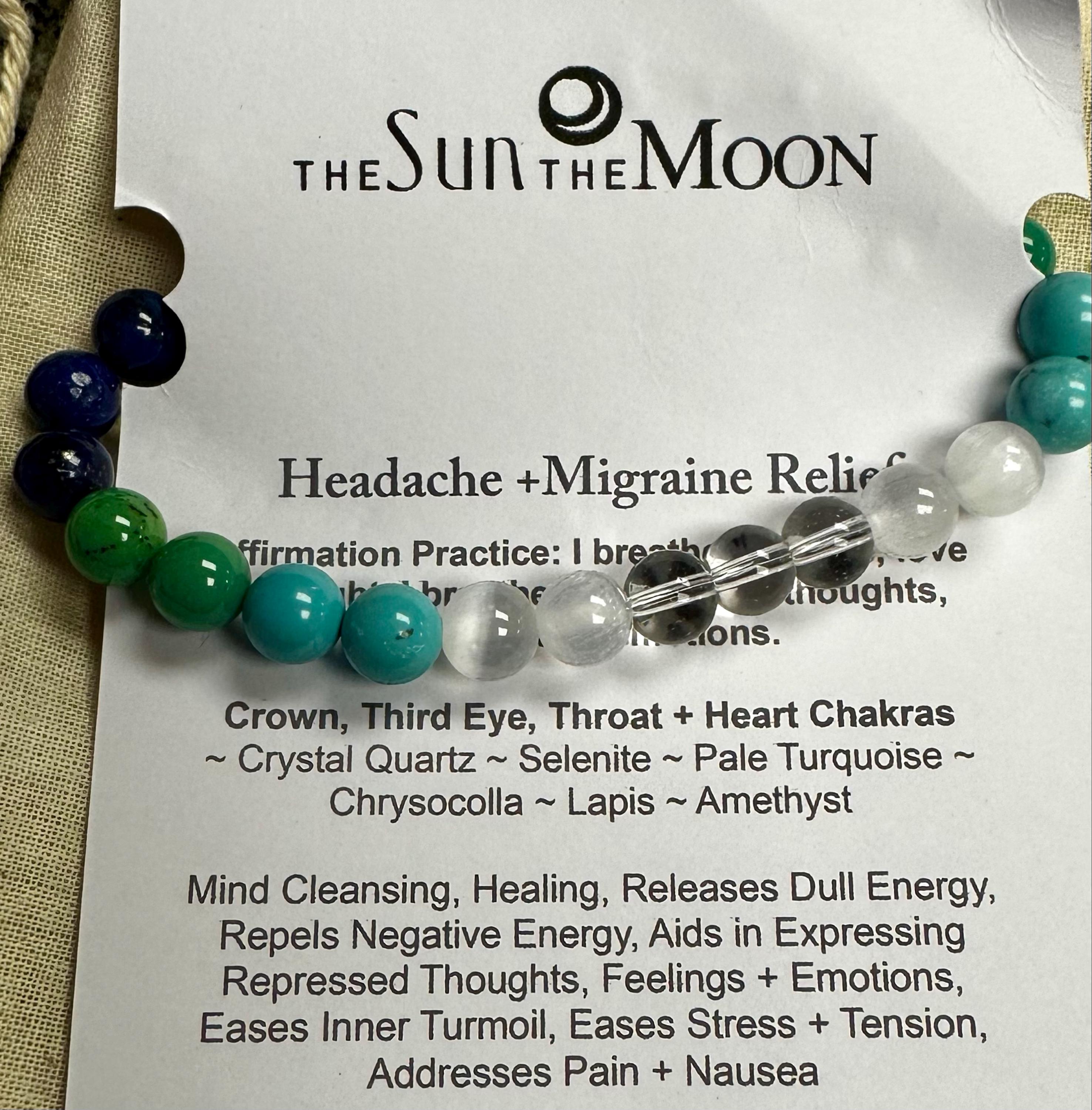 We've created our Headache + Migraine Relief bracelet for you, with a combination of metaphysical properties and chakra properties. By opening up the upper chakras through color, blockages leading to headaches are opened up and balanced.